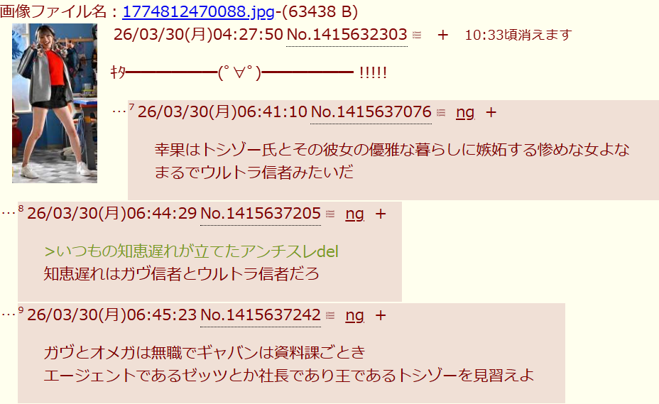 | … | 2826/03/31(火)12:26:35No.1415995024そうだねx3>声優や特撮ヒロインにも粘着してるんだから三次に興味ないって訳じゃないだろうに |