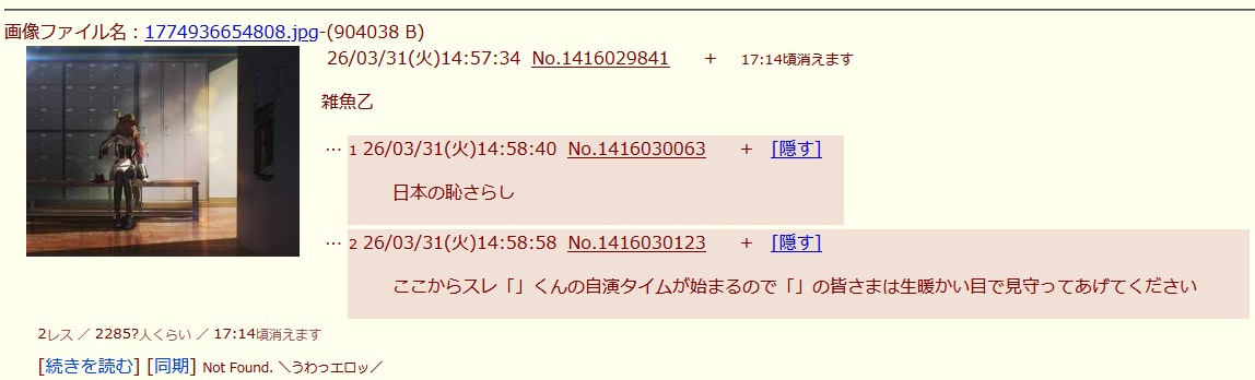 | … | 826/03/31(火)15:09:08No.1416032140+スレッドを立てた人によって削除されました |