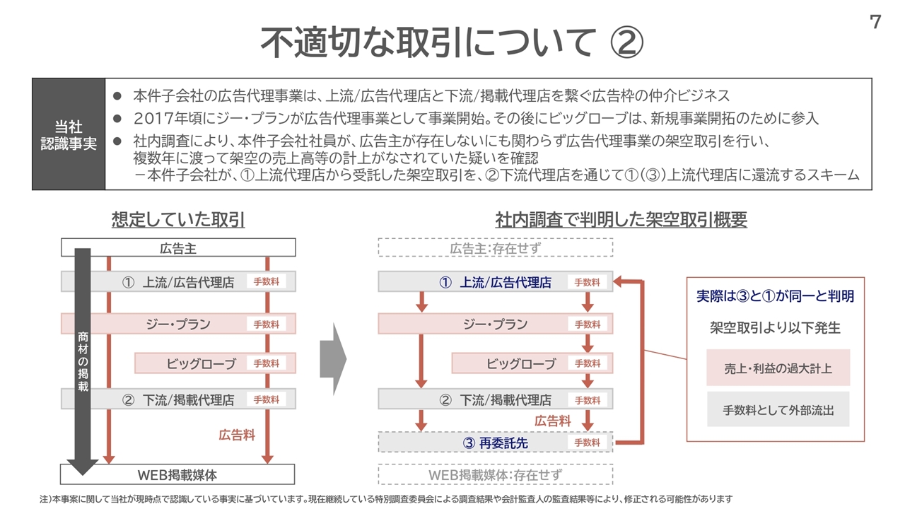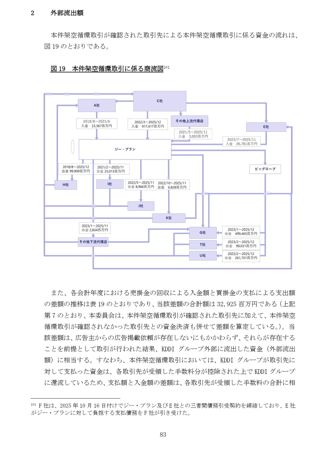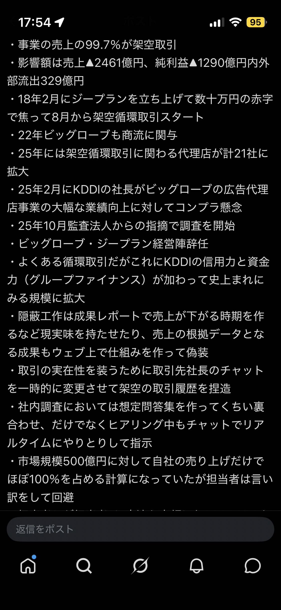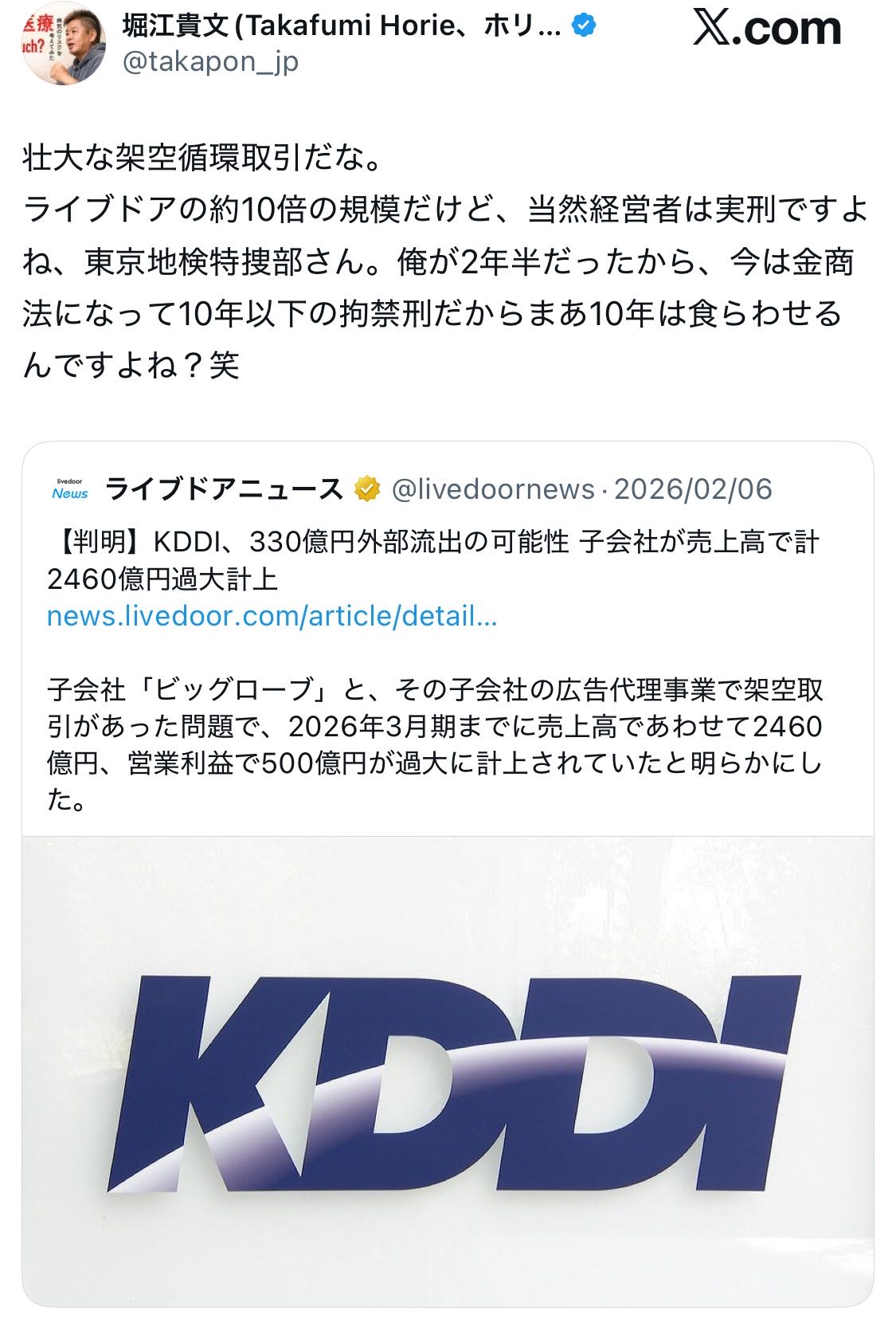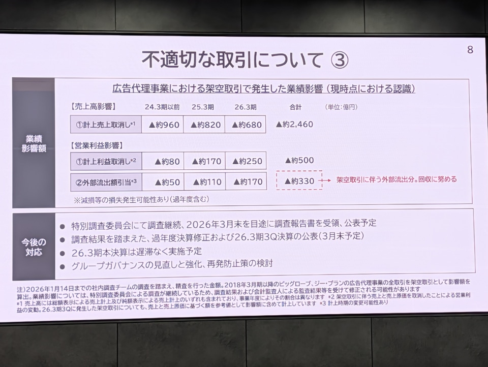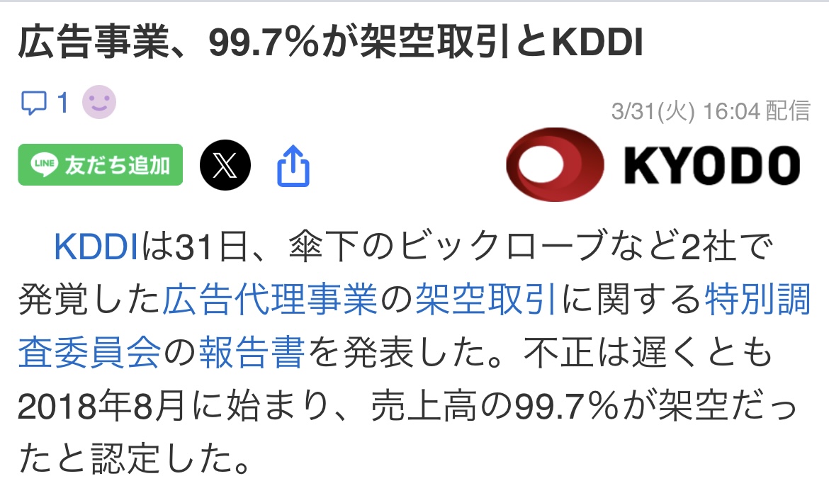 | … | 1426/03/31(火)17:15:21No.1416059130そうだねx45>2社のネット広告事業は累計で2460億円に上り、その多くが実態のない取引だった疑いがある。架空取引の結果、計330億円が外部の広告会社への手数料として流出しており、KDDIは各社からの回収を図る。 |