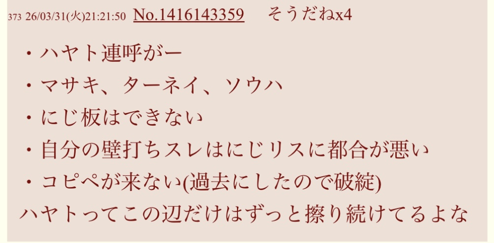 | … | 4826/03/31(火)21:33:56No.1416148721そうだねx9>>ハヤト連呼がたまに言うkusouninって何? |