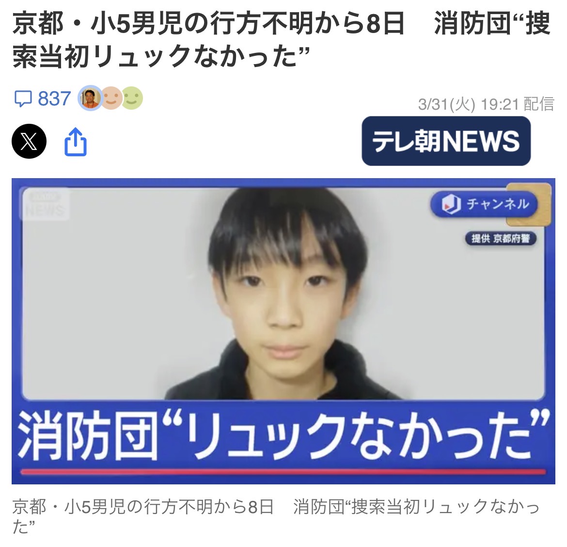 | … | 60126/03/31(火)23:35:25No.1416194581+行方不明の少年!ここを見ていたら出てきてくれ! |