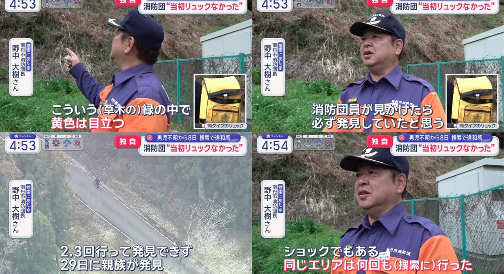 | … | 7326/04/01(水)02:49:10No.1416236793+警察から、リュックが発見された詳細な場所も聞いたそうです。見つかったのは、小学校から北西およそ3.5キロにある山間。 |