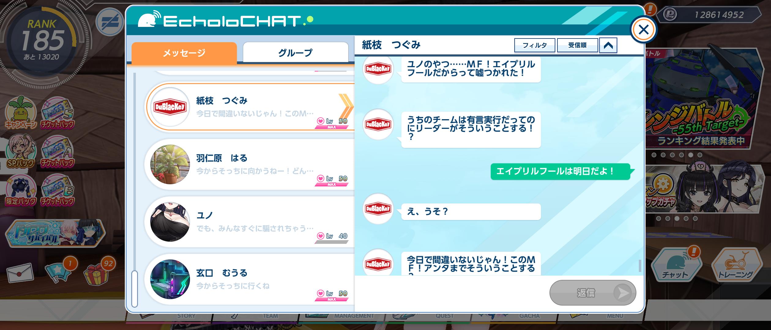 | … | 6426/04/01(水)07:54:55No.1416257193+>エイプリルフール >シンフォギアの立花響の方これであってるのかいまいちわからない コラボキャラなのにしっかりエイプリルフール用の台詞まで仕込まれてるんだ… |