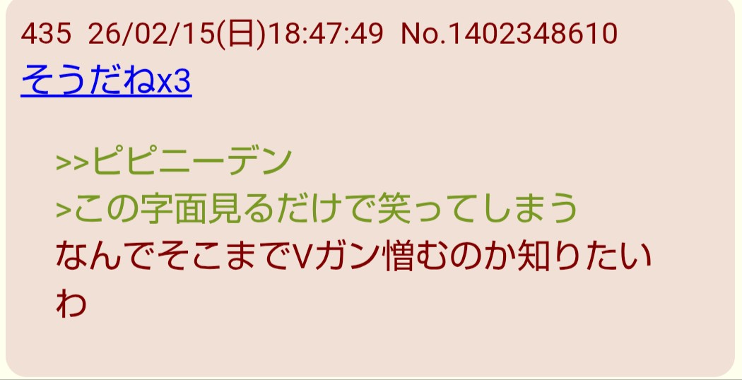 | … | 326/04/01(水)08:52:04No.1416264896そうだねx47なんでピピニーデンで笑ったらVガン憎んでることになるんだよ |