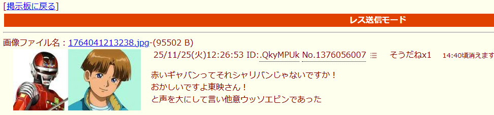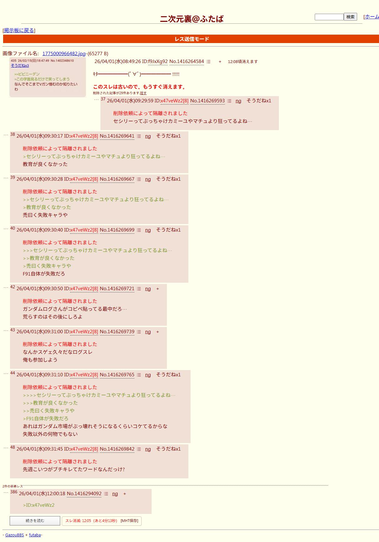 | … | 2626/04/01(水)09:18:16No.1416268148+こいつ元々mayにいたVとF91のファンの統失だからimgで定型になってること知らないんだよ… |