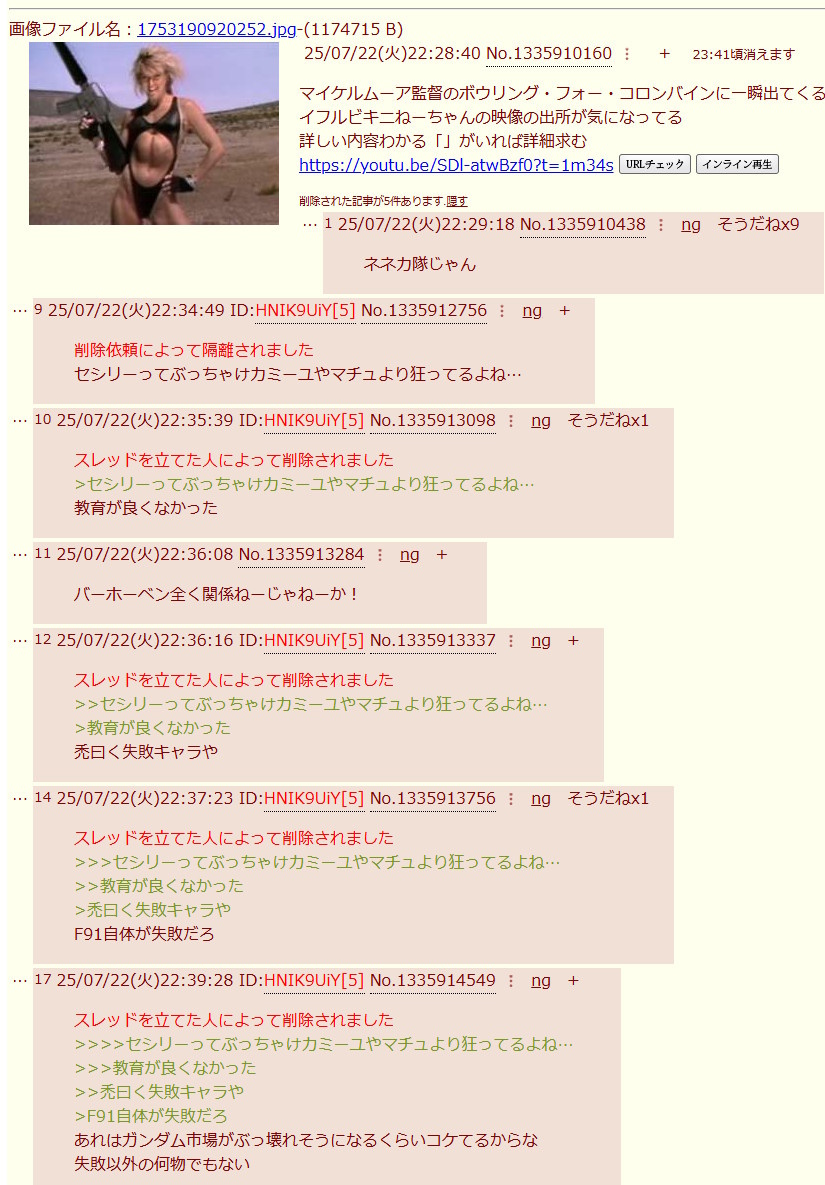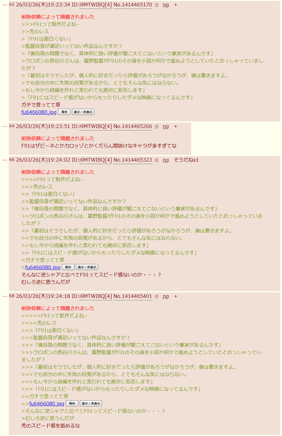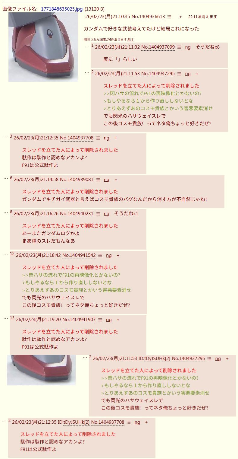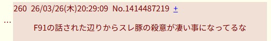 | … | 38226/04/01(水)11:50:02No.1416292187そうだねx1別作品のスレが落ちる間際に無理やりこじつけてF91叩き始めるとかならまだマシな方で |