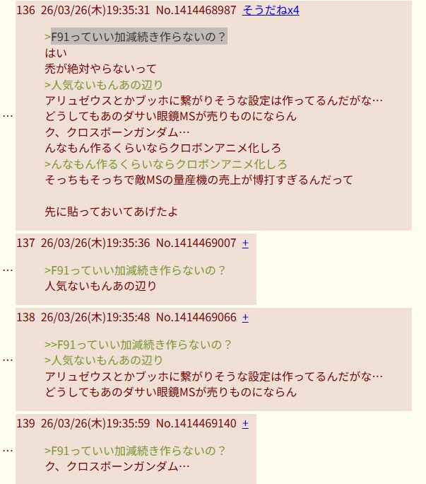 | … | 9426/04/01(水)09:41:29No.1416271092そうだねx2全世界ガンダム総選挙でF91上位だったからめっちゃイライラしてそう |