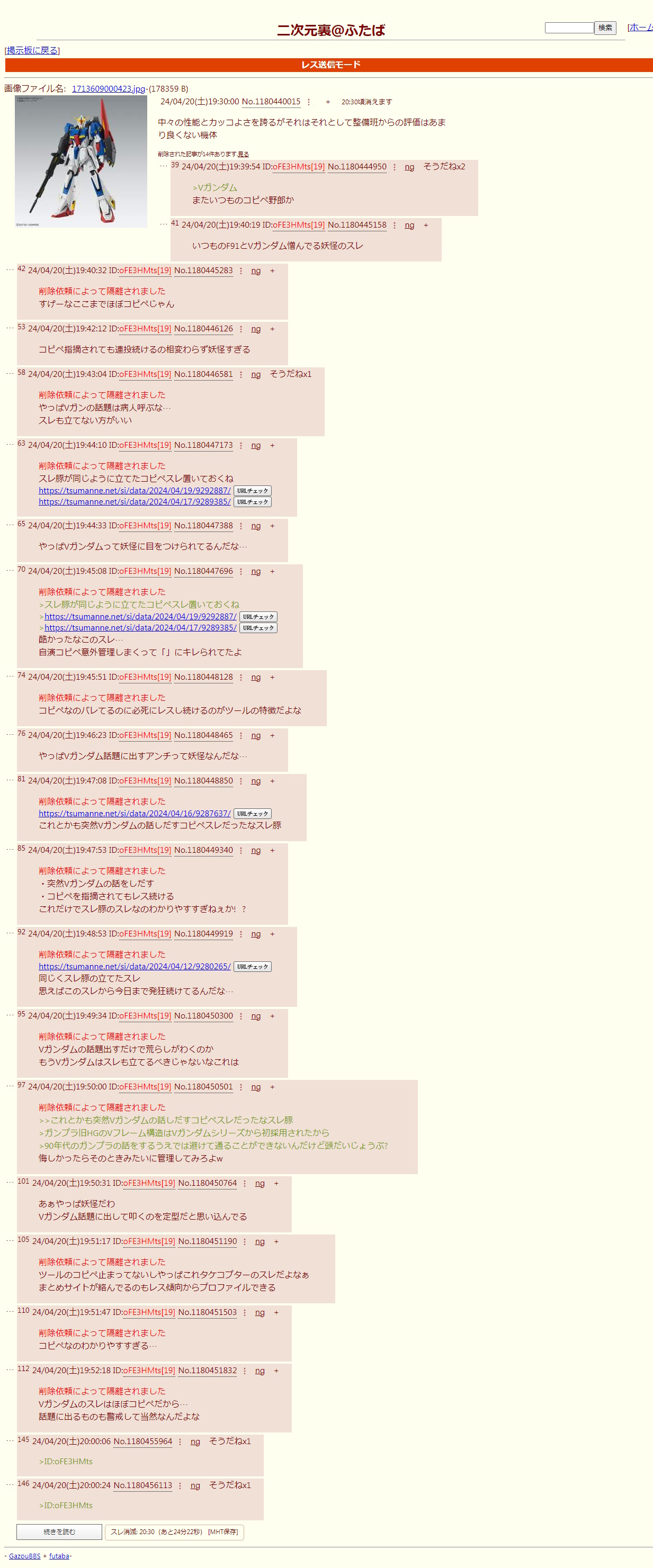 | … | 3226/04/01(水)09:23:35No.1416268800+半年に一回ぐらい平和にVガンとF91について語れるスレが立つ |