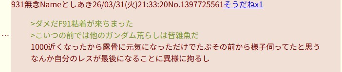 | … | 37226/04/01(水)11:36:43No.1416290019+>これってつまりガンダム粘着なんじゃないですか? |