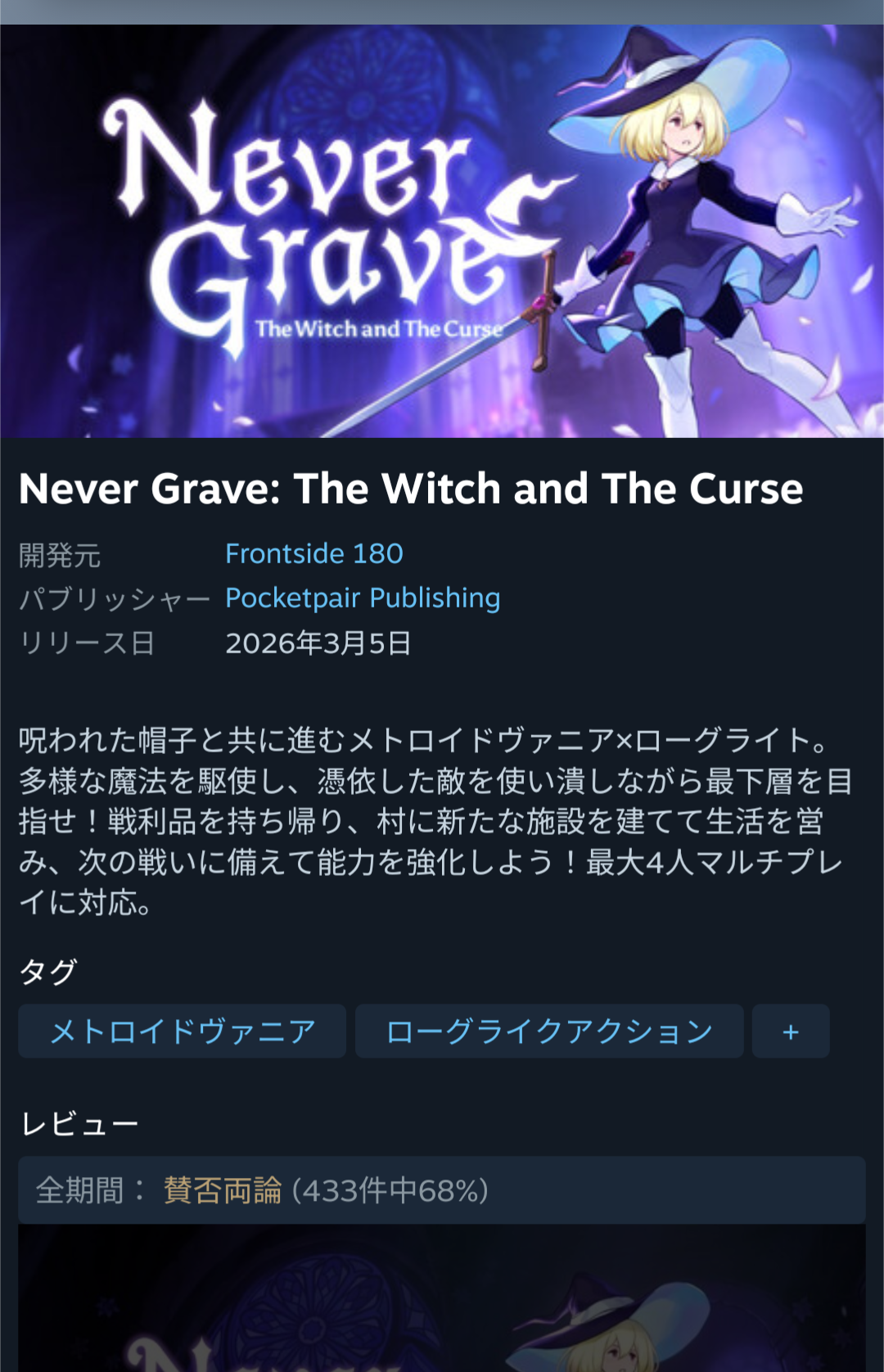 | … | 2626/04/01(水)22:59:52No.1416458433+メトロイドヴァニアとローグライトなんて皆作ってるんだからそりゃオリジナリティがないと厳しい |
