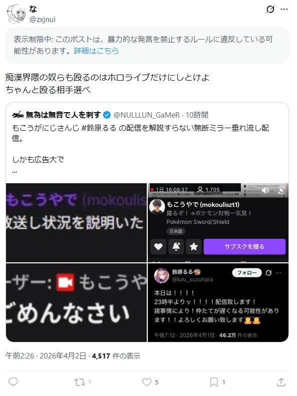| … | 7426/04/02(木)09:45:12No.1416528008+>>完全に視聴者層被ってる自覚があるから今回ちゃんと謝ったのに |