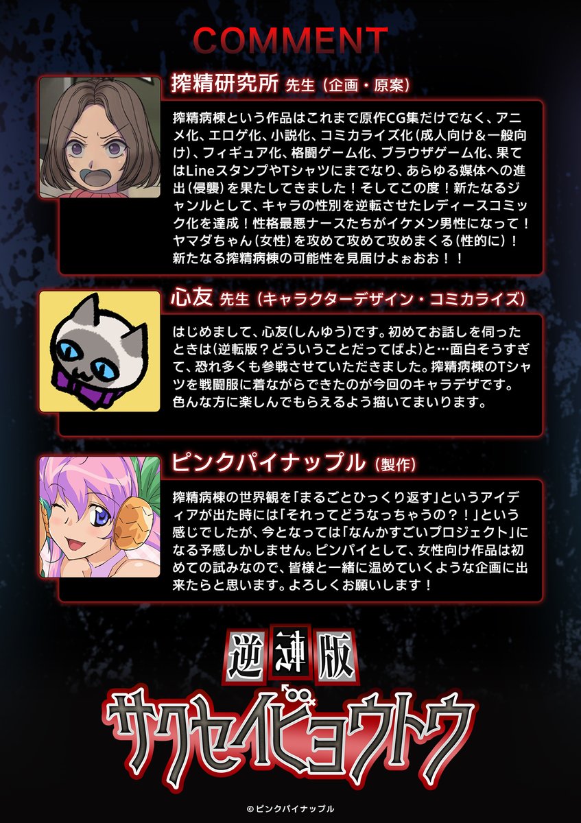 | … | 9726/04/02(木)17:00:04No.1416611832+>『逆転版サクセイビョウトウ』は当初、搾精研究所とピンパイの雑談から生まれた企画でしたが、搾精病棟ブランドの新たなプロジェクトとして本格的に取り組みを始め |
