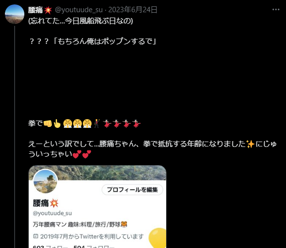 | … | 3226/04/03(金)01:13:35No.1416755293そうだねx2そんなに腰痛酷いの? |
