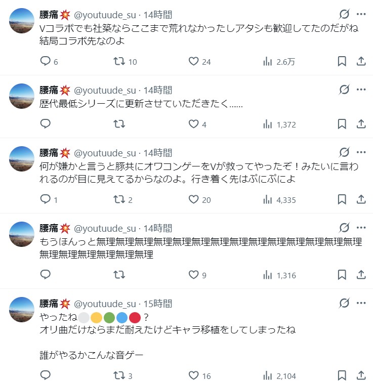 | … | 2726/04/03(金)14:40:50No.1416850483そうだねx11社築はバンナムが頭下げてきたから仕方なくシャニソンの案件なんて受けたからそのせいで時間が取れなくて私的にやってるプロセカのイベ走りきれなかったわって文句言うぐらい音ゲーは好きだぞ |