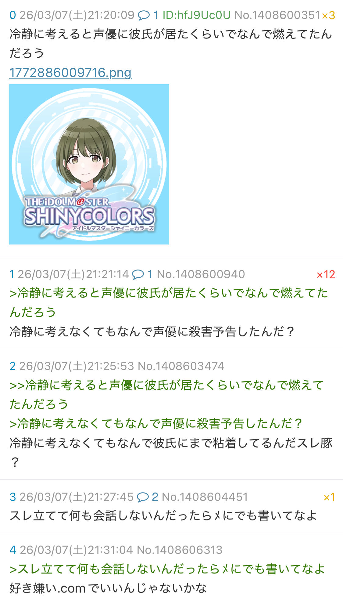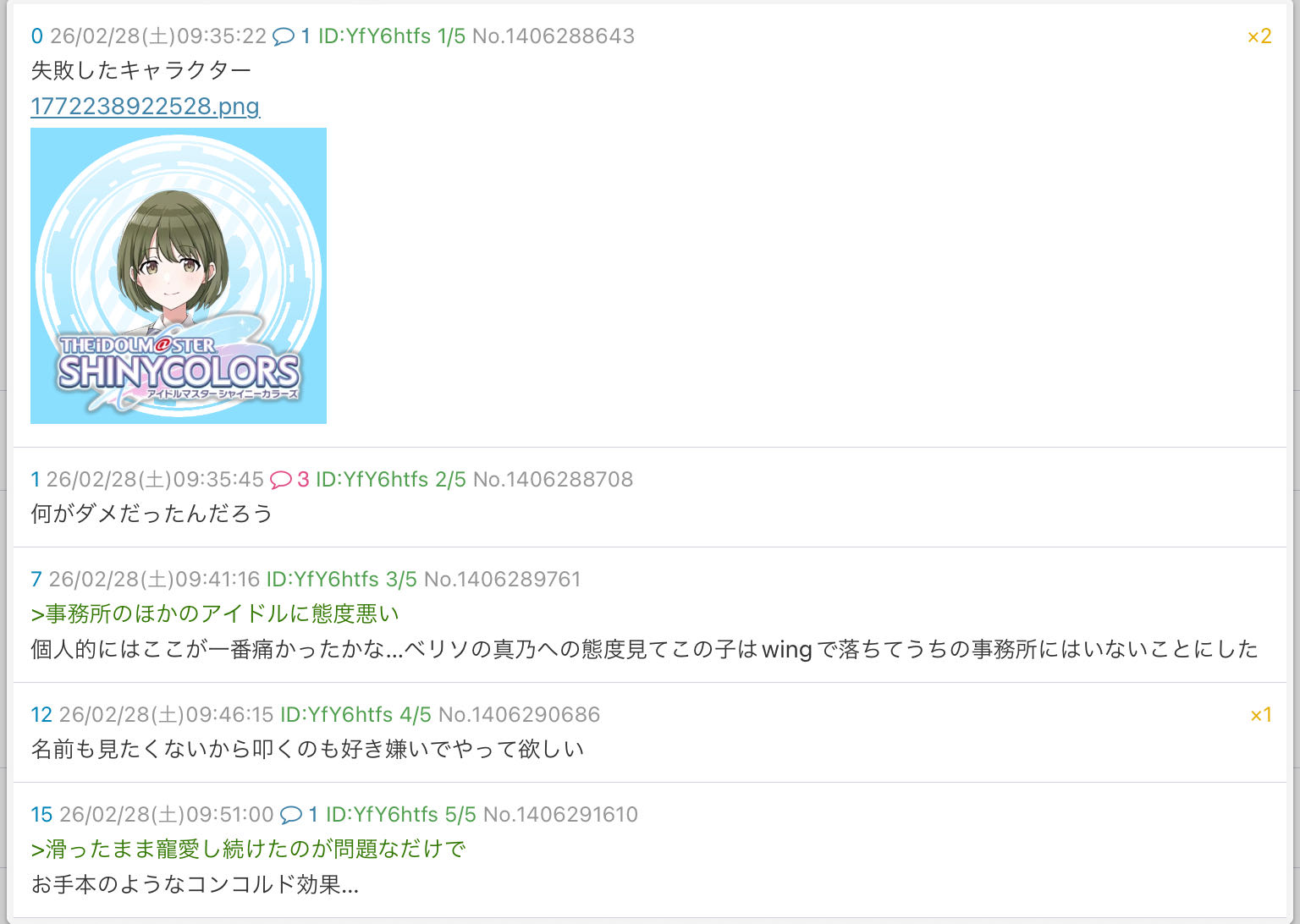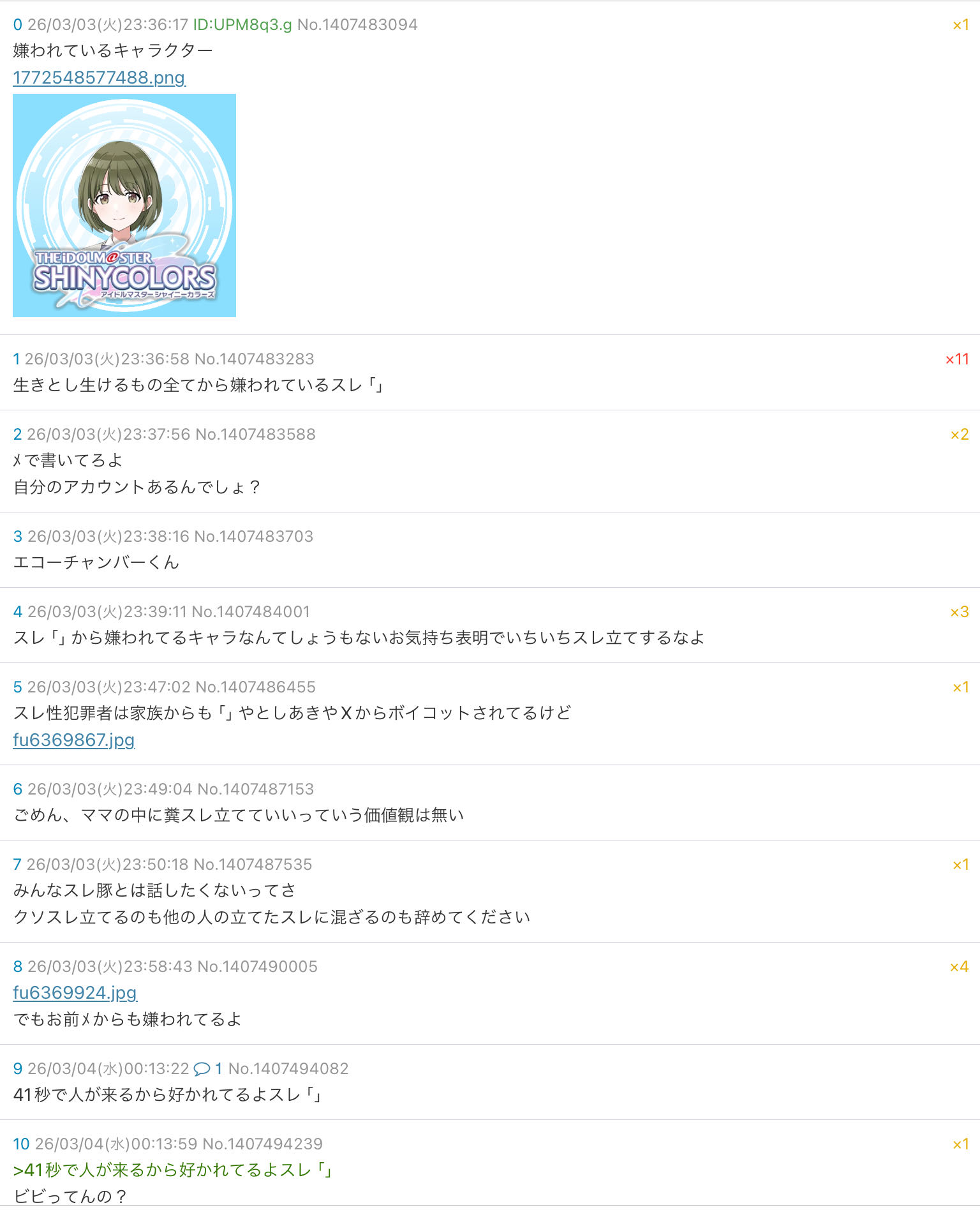 | … | 10426/04/03(金)18:45:21No.1416906001+>X里ってなんでこの子を虐めてるの?シャニPから見ても見苦しいからやめたほうがいいと思う |