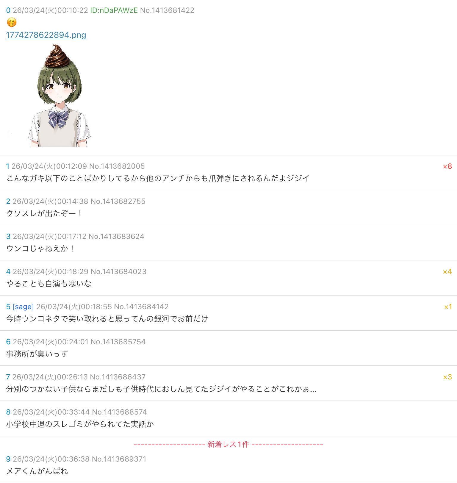 | … | 526/04/03(金)17:34:26No.1416886667そうだねx2また自レスしか残らない勢いで管理して笑い物になるんですか |