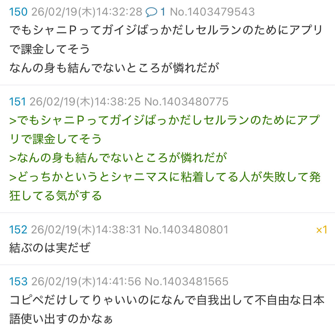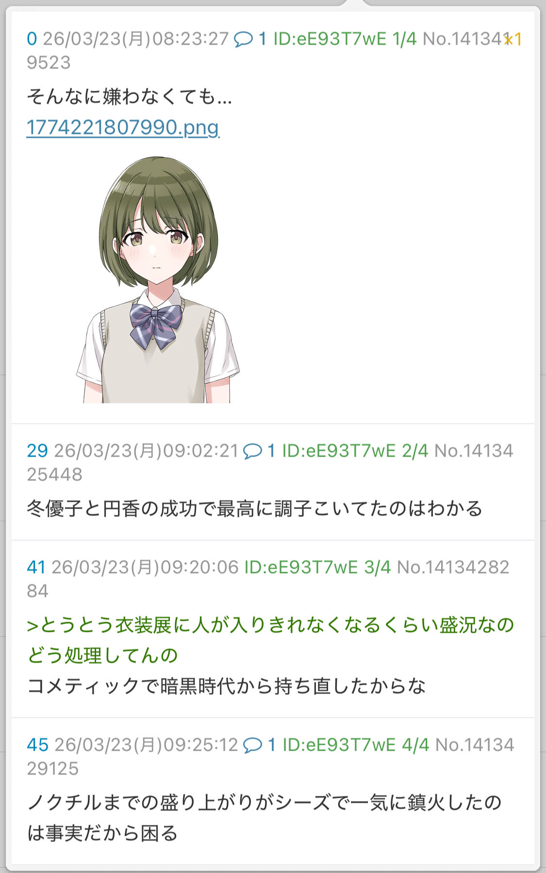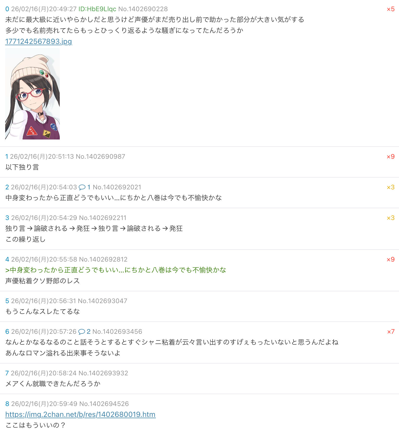 | … | 12026/04/03(金)18:52:54No.1416908455+エムPってなんでこの子を虐めてるの?X里から見ても見苦しいからやめたほうがいいと思う |