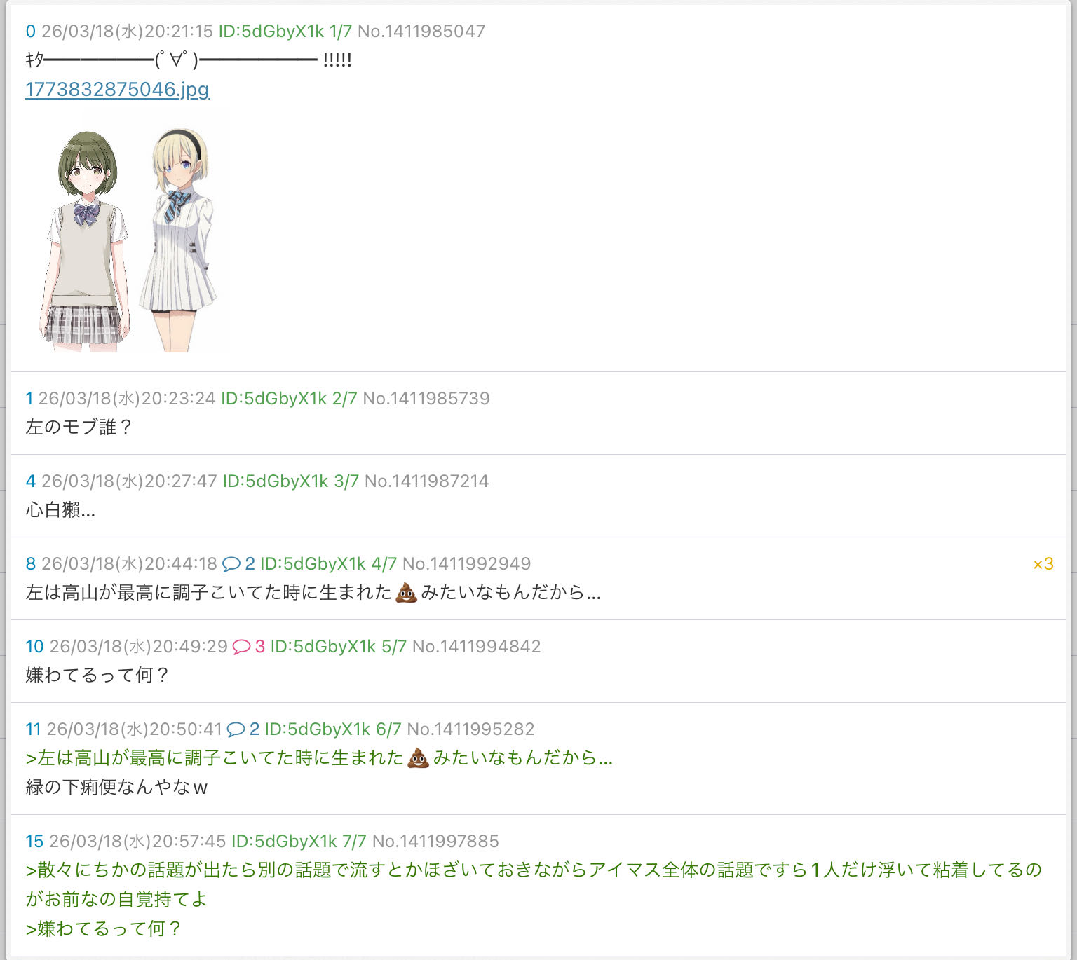 | … | 5126/04/03(金)18:21:27No.1416899001+X里ってなんでこの子を虐めてるの?ミリPから見ても見苦しいからやめたほうがいいと思う |
