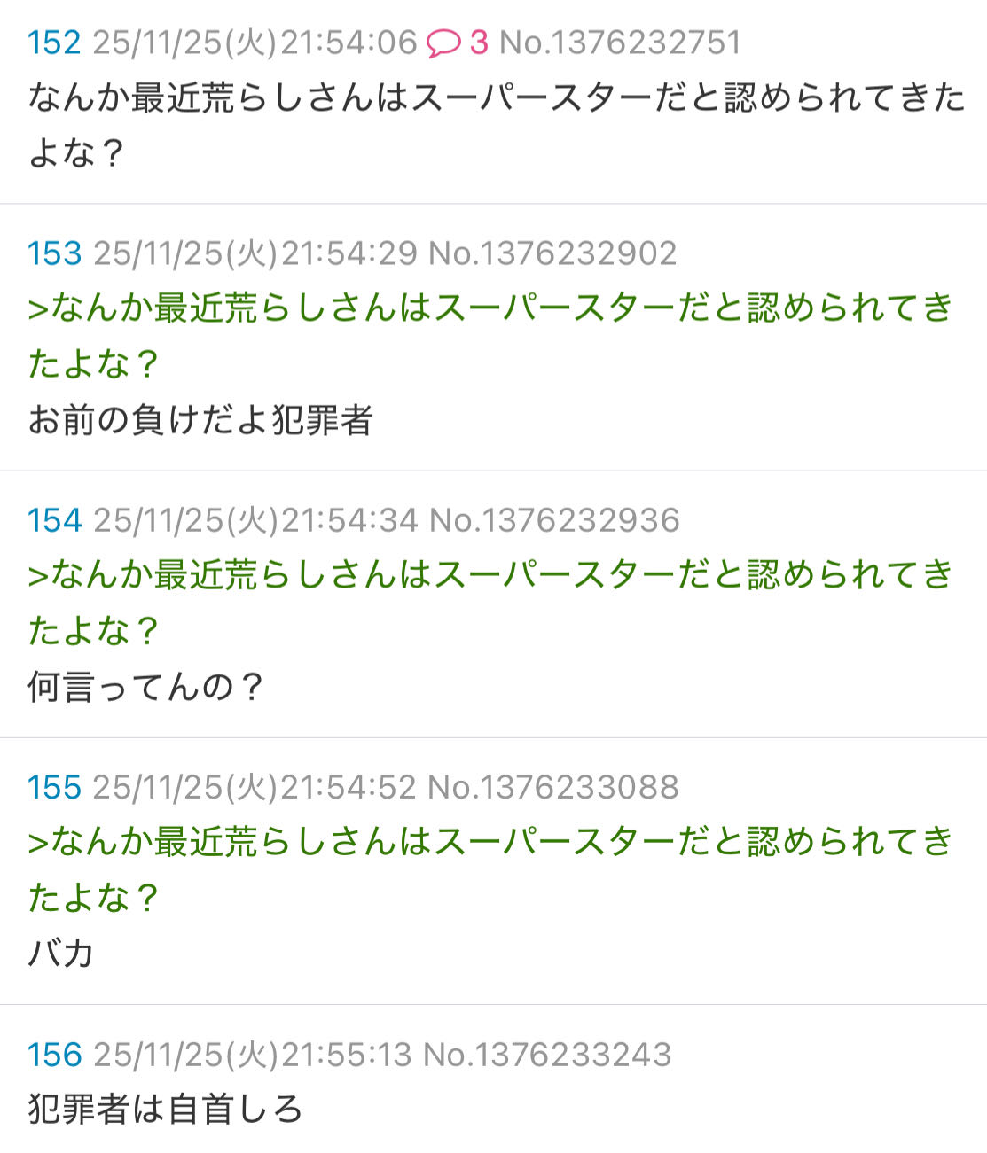 | … | 4726/04/03(金)18:20:43No.1416898795そうだねx3見てすら居ないライブの配信実況スレを荒らして追い出されたので腹いせで翌日にライブ会場への爆破予告と出演者に対する殺害予告出すような犯罪者にメンツもなにもありません |
