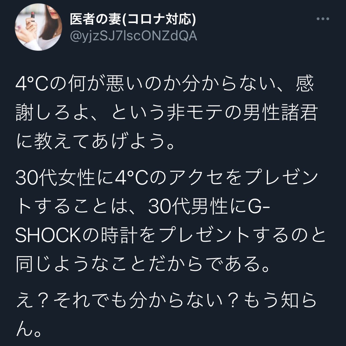 | … | 126/04/03(金)22:59:57No.1417002349そうだねx316>女性に4℃は男性にGショックを贈るのと同じぐらいだそう |