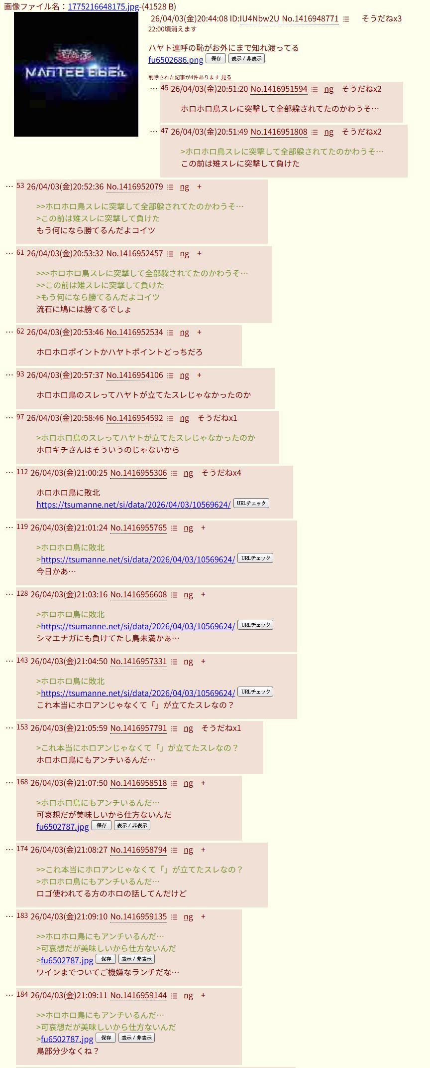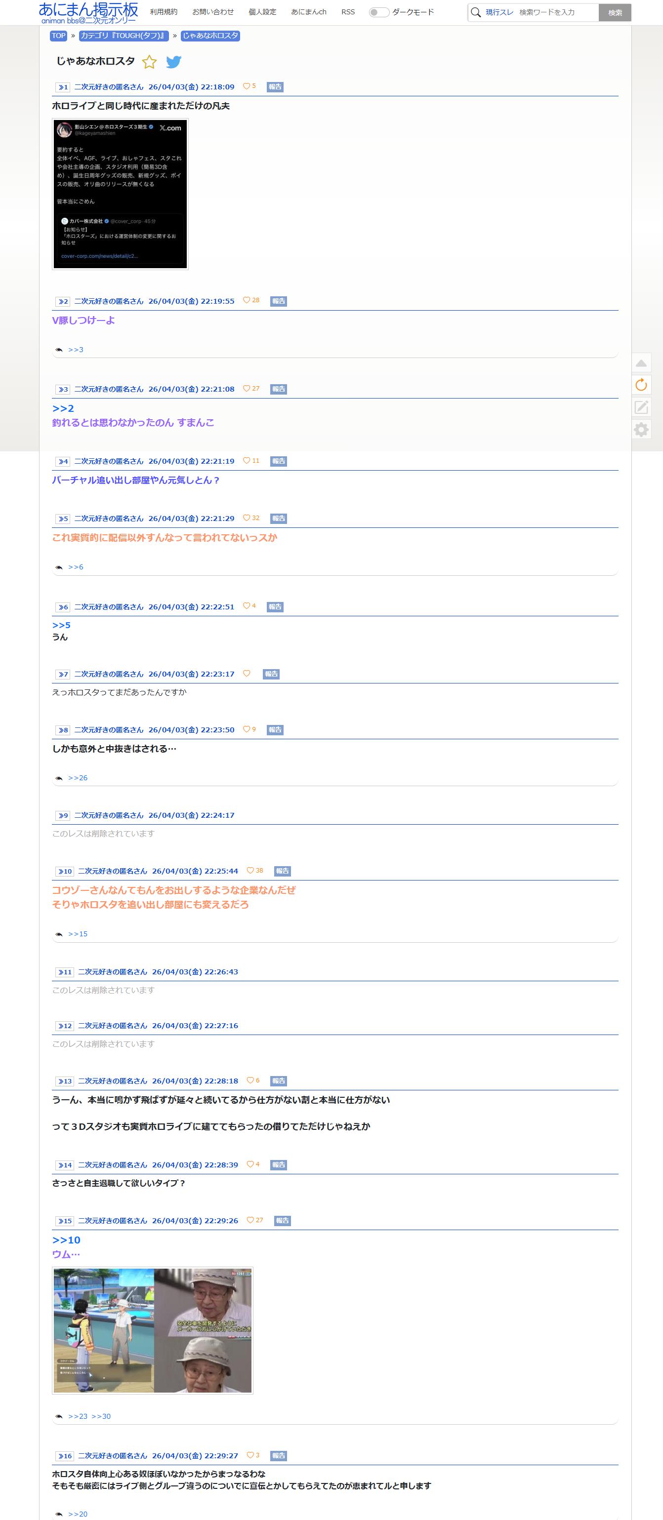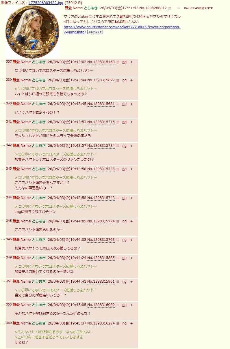 | … | 88426/04/04(土)01:23:37No.1417046044+>これからはimgでホロスレ立ってもホロスタの話題出したらにじリスが〜で潰せるようになるのか |