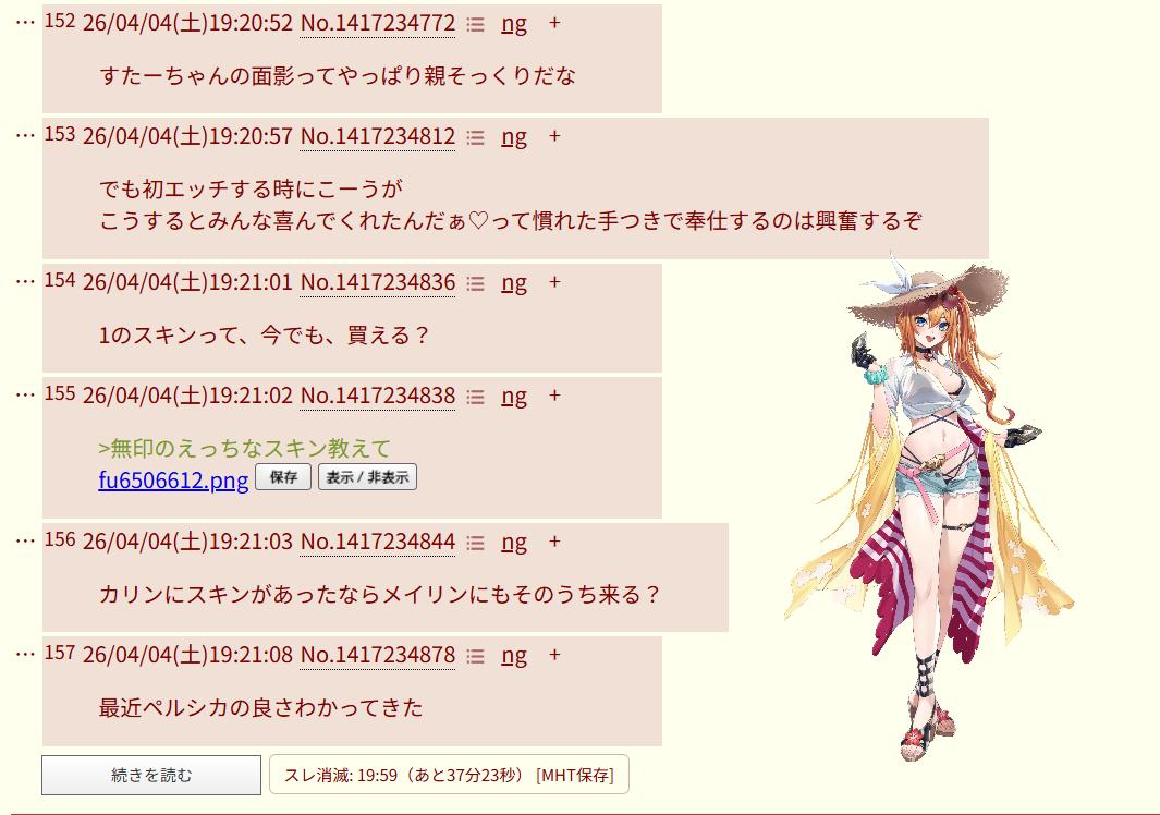 | … | 1026/04/04(土)18:38:12No.1417220477+1に出てるスキンだから変にタイムリーだ |