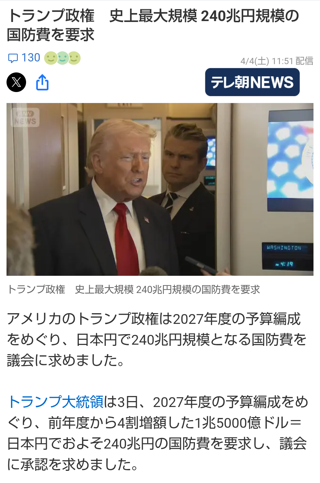 | … | 3026/04/05(日)04:45:06No.1417386491そうだねx6>トランプが昨年成し遂げたと主張している経費削減額が本人の自己申告で約30兆円 |
