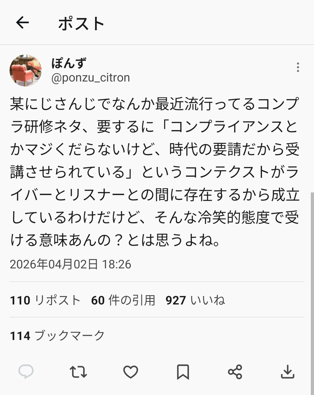 会社のコンプラ研修を小馬鹿にしてるやつの予後悪そうこのスレは古いので、もうすぐ消えます。