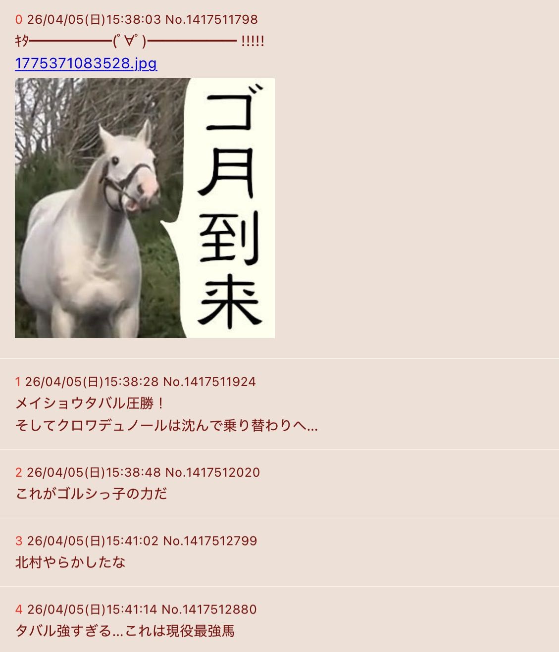 | … | 626/04/05(日)15:44:23No.1417513883そうだねx7>メイショウタバル圧勝! |