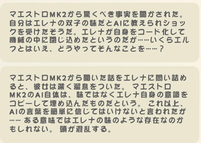 | … | 8526/04/05(日)17:33:50 ID:erRaZe2kNo.1417545754+>自我の芽生えたAIはモナティアム法で廃棄されるからマエストロは巧妙に自我を隠してるにゃん |
