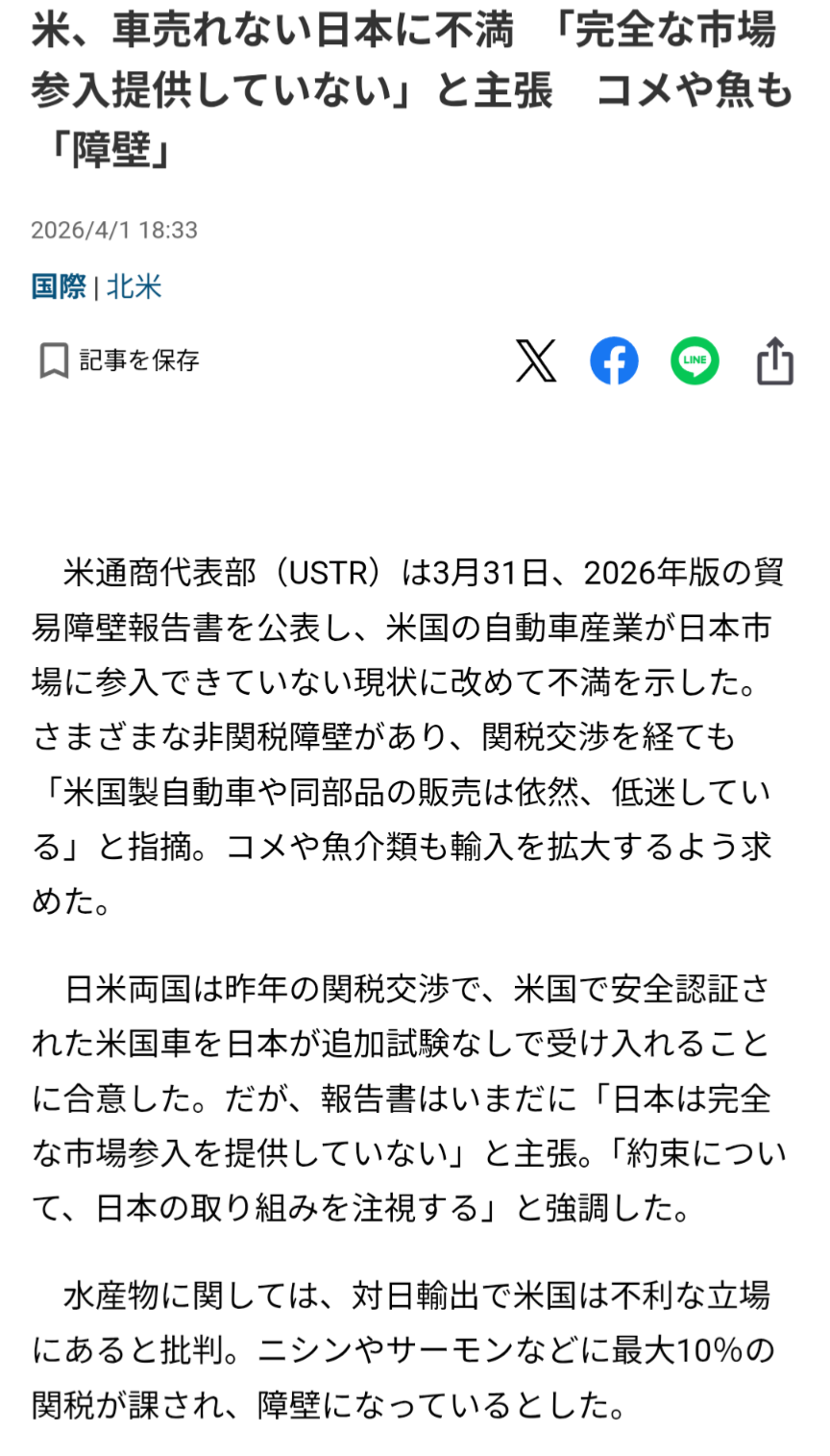 | … | 20326/04/06(月)03:47:38No.1417735582+オバマも米国車売れないのは差別だって騒いでたので向こうのトップ層には常識なんだろう |