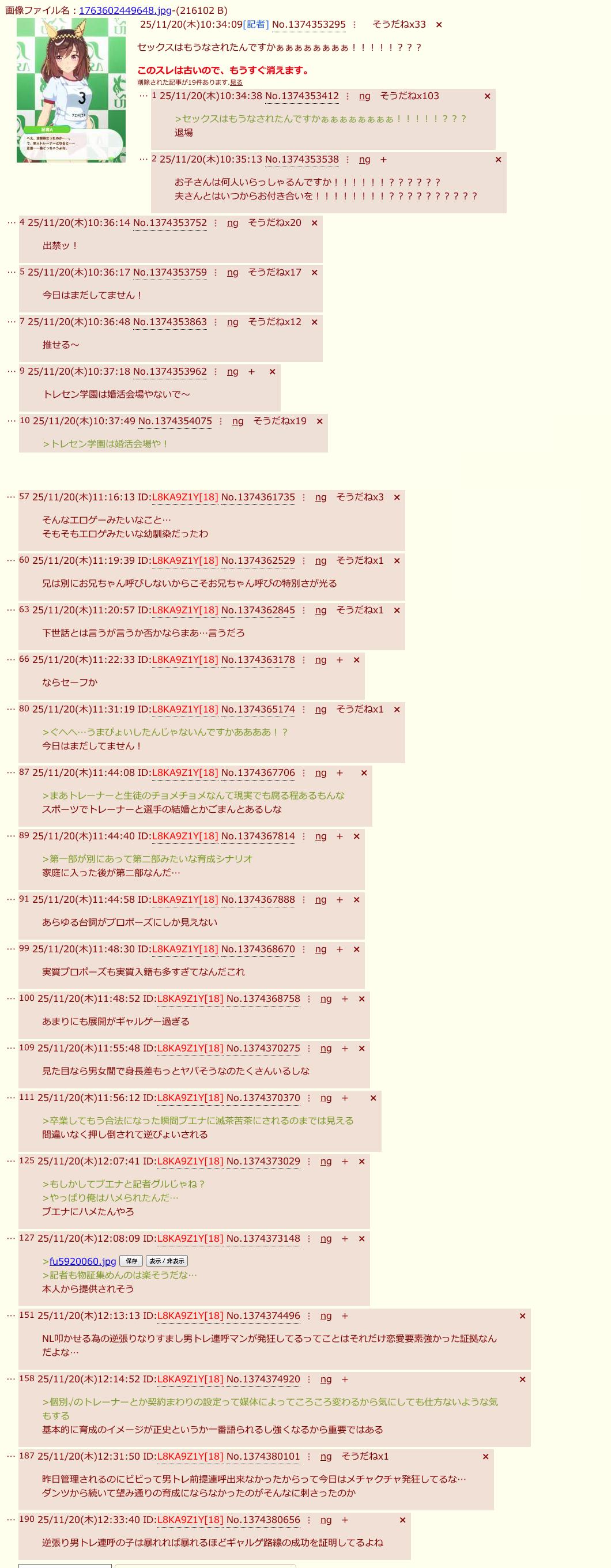 | … | 8326/04/06(月)08:12:31No.1417749458+>女トレだと全くレス付かないね |