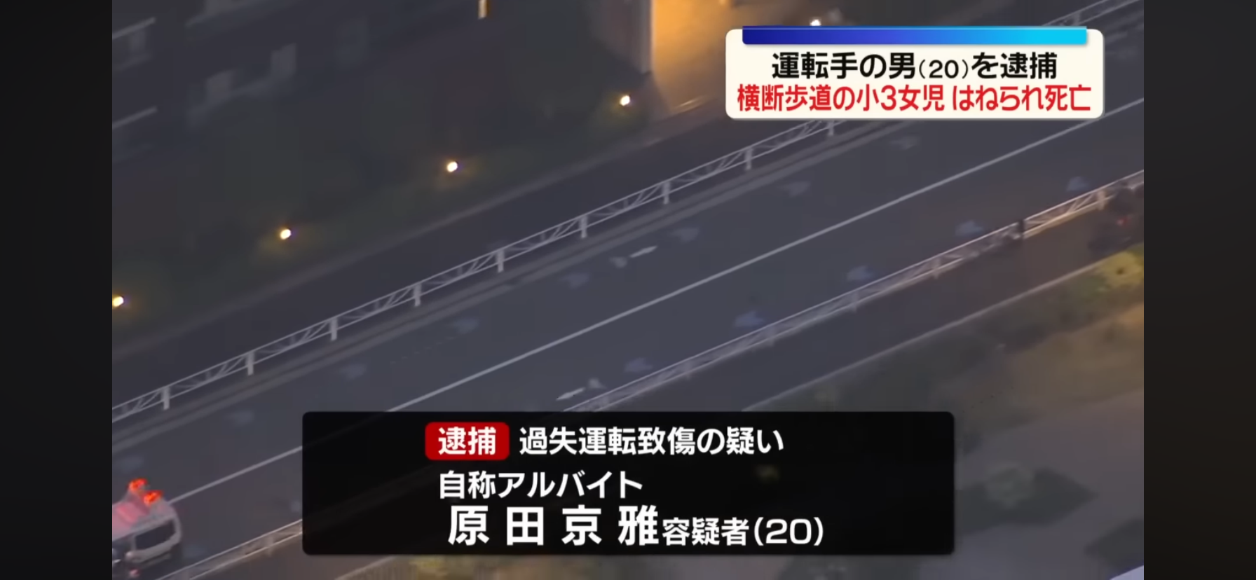 2日午後5時半ごろ、横浜市戸塚区戸塚町の交差点で、近くに住む小学3年生の中西由衣さん(8)が乗用車にひかれ、病院に搬送されたが約1時間半後に死亡した。神奈川県警戸塚署は、乗用車を運転していた自称同市栄区飯島町、アルバイトの原田京雅容疑者(20)を自動車運転死傷処罰法違反(過失運転致傷)の疑いで、同日に現行犯逮捕。容疑を過失運転致死に切り替えて捜査している。