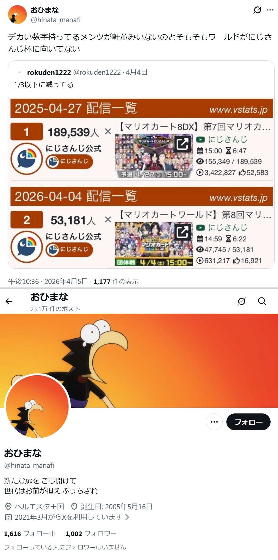 | … | 80926/04/06(月)12:27:35No.1417788582+>>>>マリカ杯…去年と比べてめちゃくちゃ同接が減っていた… |