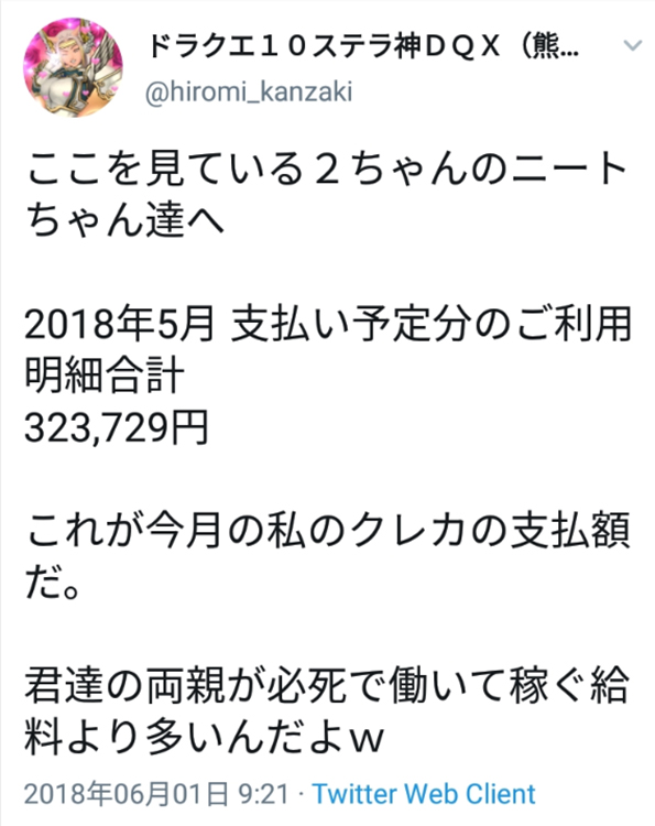 | … | 6126/04/06(月)19:17:47No.1417881018そうだねx2親が高給取りとはいえ無職が毎月30万ぐらい廃課金してるのきついな |