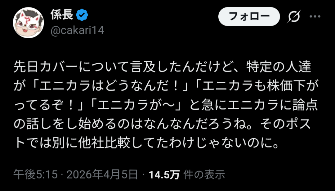 | … | 11026/04/06(月)21:08:14No.1417921614そうだねx11そもそもスレ画の奴はしくじり企業とかいって円谷のデマ撒き散らしてた奴じゃん |
