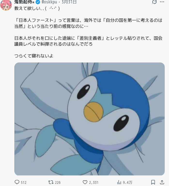 | … | 11226/04/06(月)21:46:42No.1417936728+>Xの仕様は右左関係なくグローバルになったのに何でグローバリスト自称してるパヨクが嫌がってんだよ |