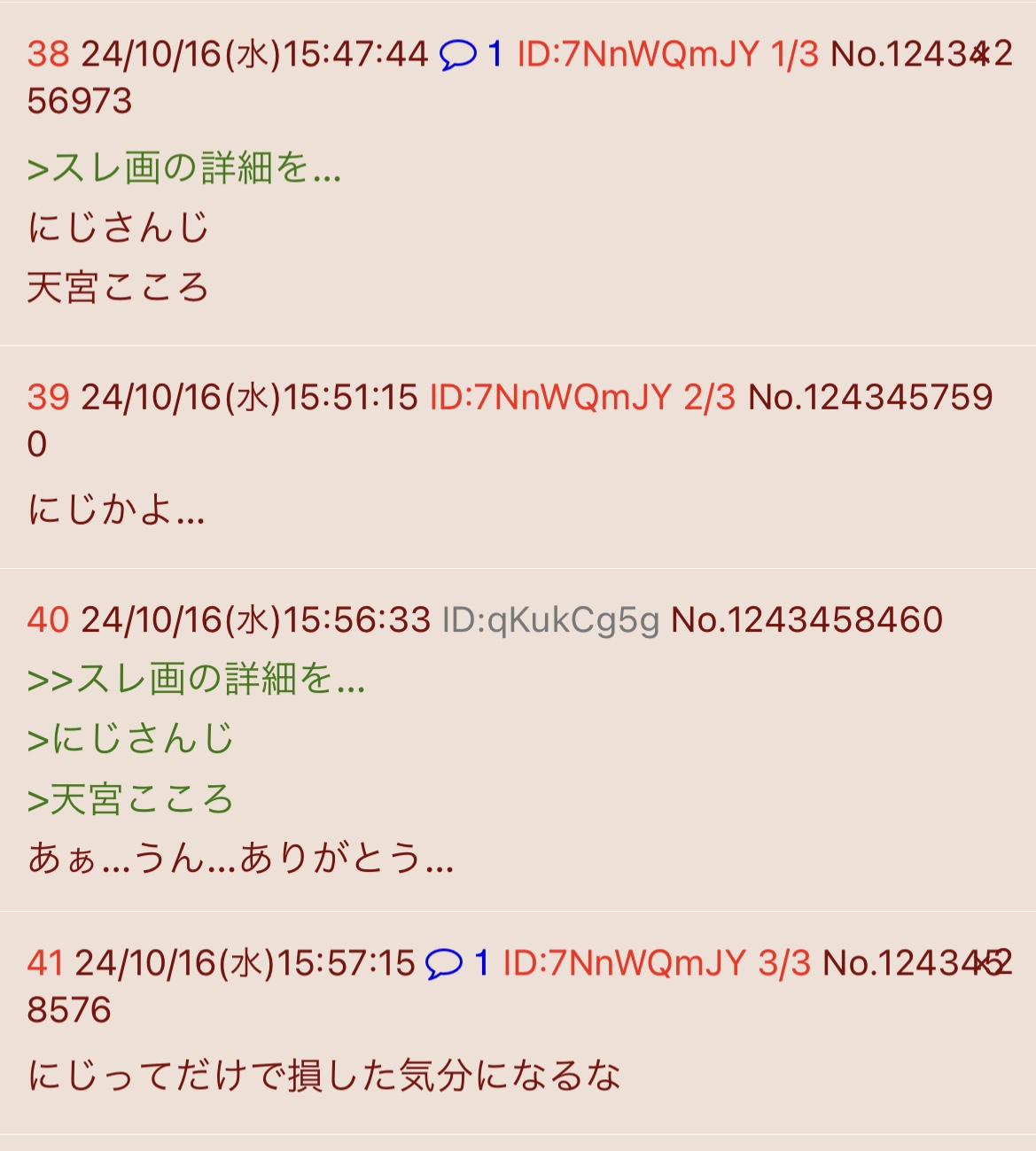 | … | 6026/04/06(月)22:35:36No.1417956552そうだねx2>新年度で忙しくて全然虹裏見てなかったがこいつまだやってんのかこんなこと |