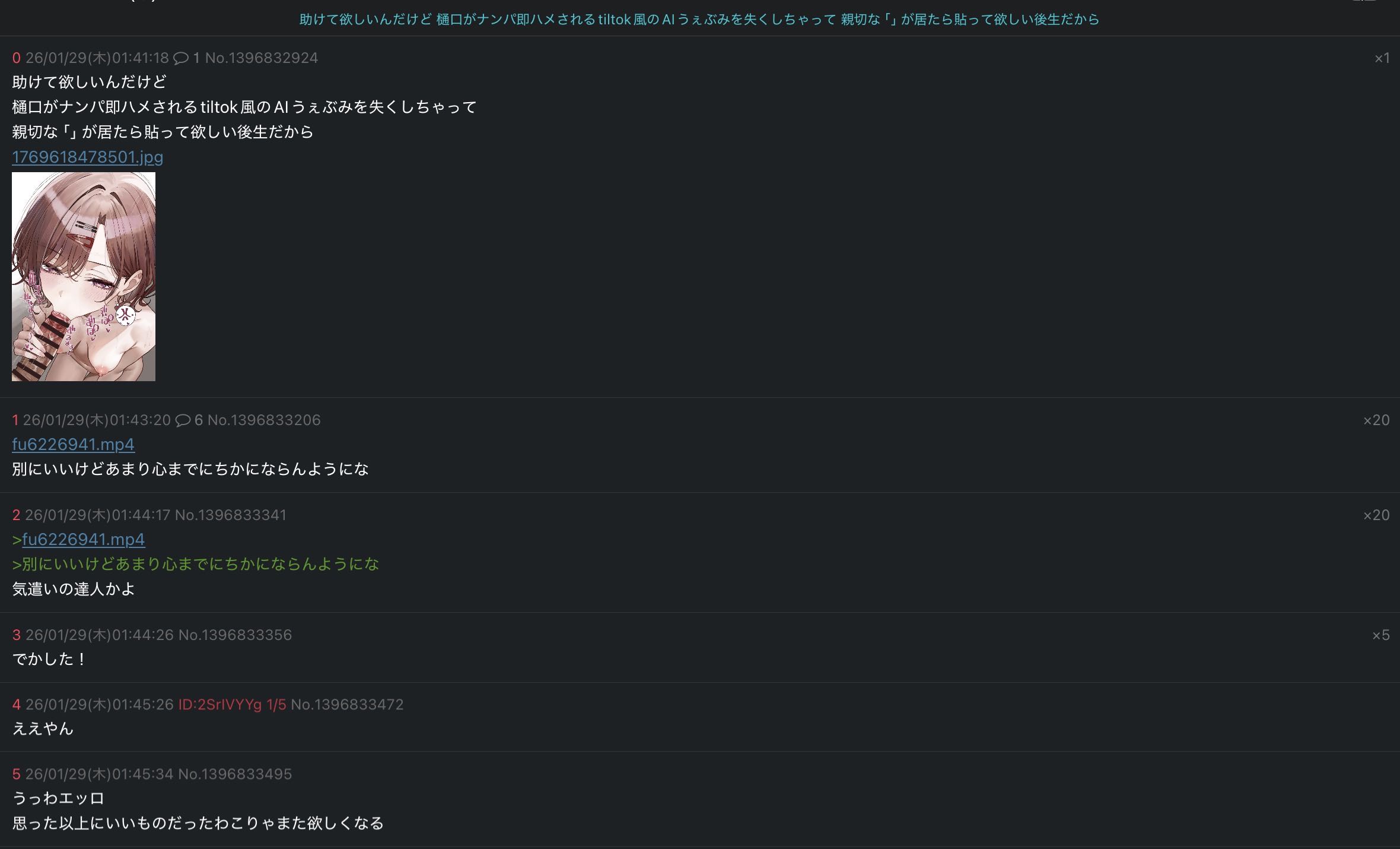 | … | 8126/04/06(月)23:17:54 ID:My48IW2ANo.1417972124+樋口のtiktok風のエロ動画が忘れられない |