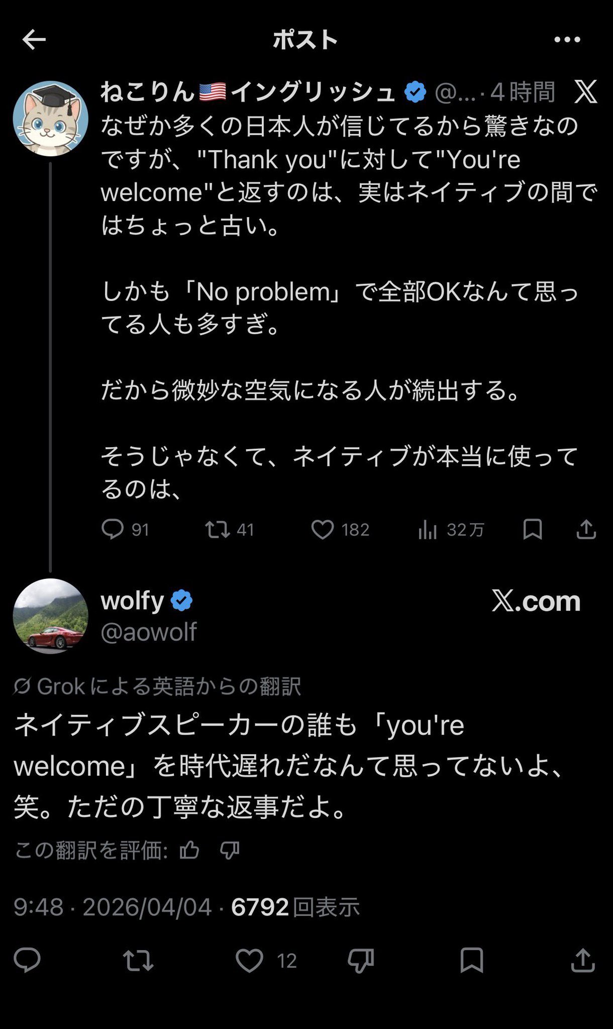 | … | 1026/04/07(火)00:47:18No.1417998379そうだねx2下は下で英語話者全体を勝手に語ってるんだが痛快ではある |