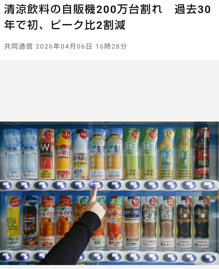 | … | 2626/04/07(火)15:53:26 ID:IN27zHmQNo.1418113435そうだねx1米の値上げと同じでやり過ぎた結果米食う習慣が無くなったのと同じで自販機で買う習慣が無くなったんだよな |