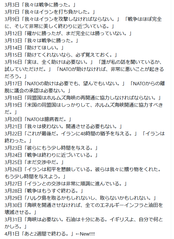 | … | 1926/04/07(火)20:11:29No.1418181310そうだねx2>>トランプが6日の記者会見で、イランとの停戦に向けた交渉は「うまくいっている!!!!!!!111!」 |