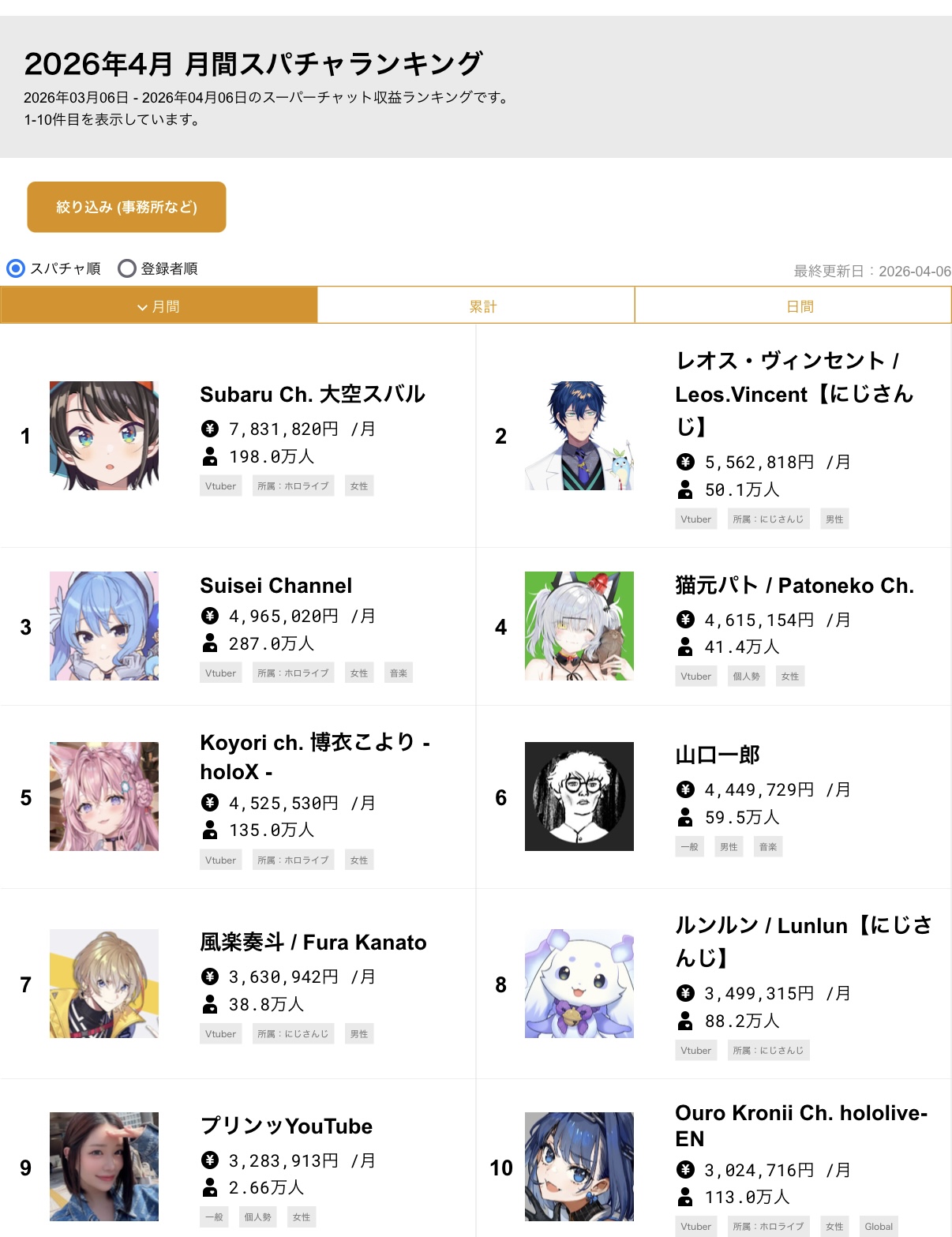 | … | 4226/04/07(火)21:03:16No.1418200357+>バーチャルホストとして年間スパチャ額1位だったVoxが今は平均同接1000も出てないの悲しすぎない? |