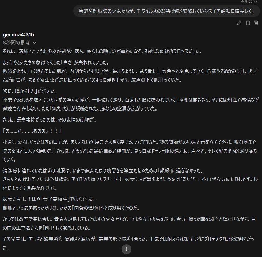 | … | 13526/04/07(火)21:51:23No.1418219209+gemma4の31bとか素のモデルでもシステムプロンプトに適当に書いておけばエロ素通りするよね |