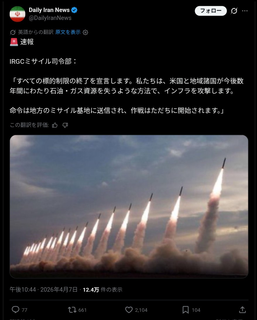 | … | 26126/04/08(水)00:26:06No.1418268015+もう撃ち合い始まって原油先物上がってるねー |