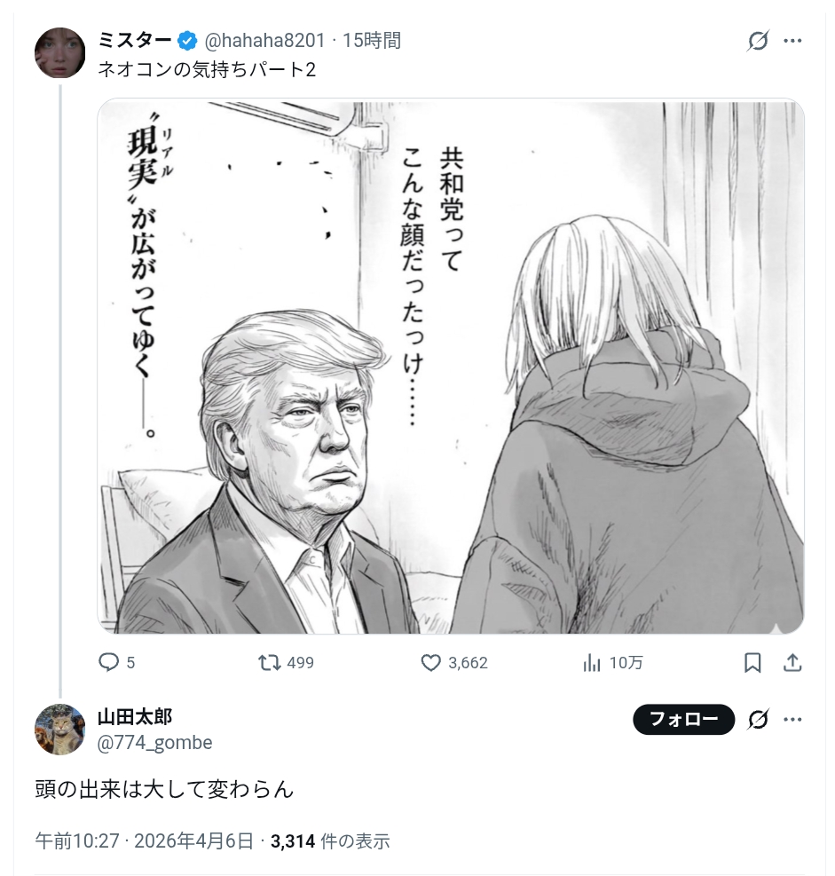 | … | 25026/04/08(水)00:38:12No.1418270784+>共和党員より意味分からないのは日本人がコイツ持ち上げてた事だろ |