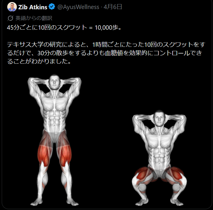 | … | 7026/04/08(水)05:59:04No.1418297228+スレ画みたいな1時間ごとのスクワットとか現実的じゃねえって人は1レップに7秒かけるスローなスクワット10回を3セットが血糖値コントロールに良いらしい |