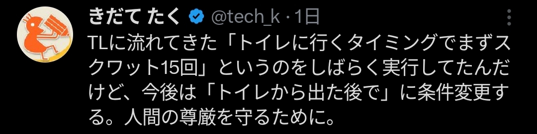 | … | 1326/04/08(水)05:11:03No.1418295976そうだねx1>スレ画の原文を要約すると人間の筋肉は一定時間使わないとお休みモードに入るからそれをスクワットで定期的に目覚めさせることで常に筋肉のエンジンが掛かってる状態にさせてなんか健康に良い感じになるらしい |