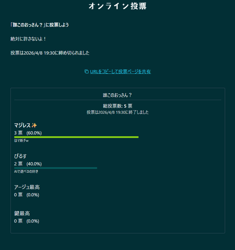 | … | 6026/04/08(水)19:16:51 ID:BRqiQzBANo.1418440837そうだねx8その気になれば票数操作出来るんなら虚無じゃん |