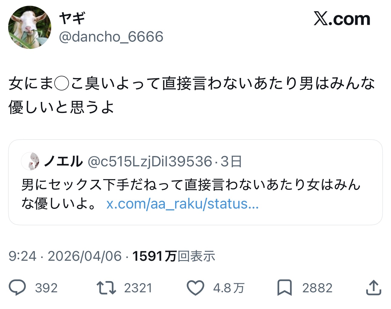 | … | 18326/04/08(水)23:42:23No.1418552135+エロがタブー視されてるのと密接に関わってるからな… |